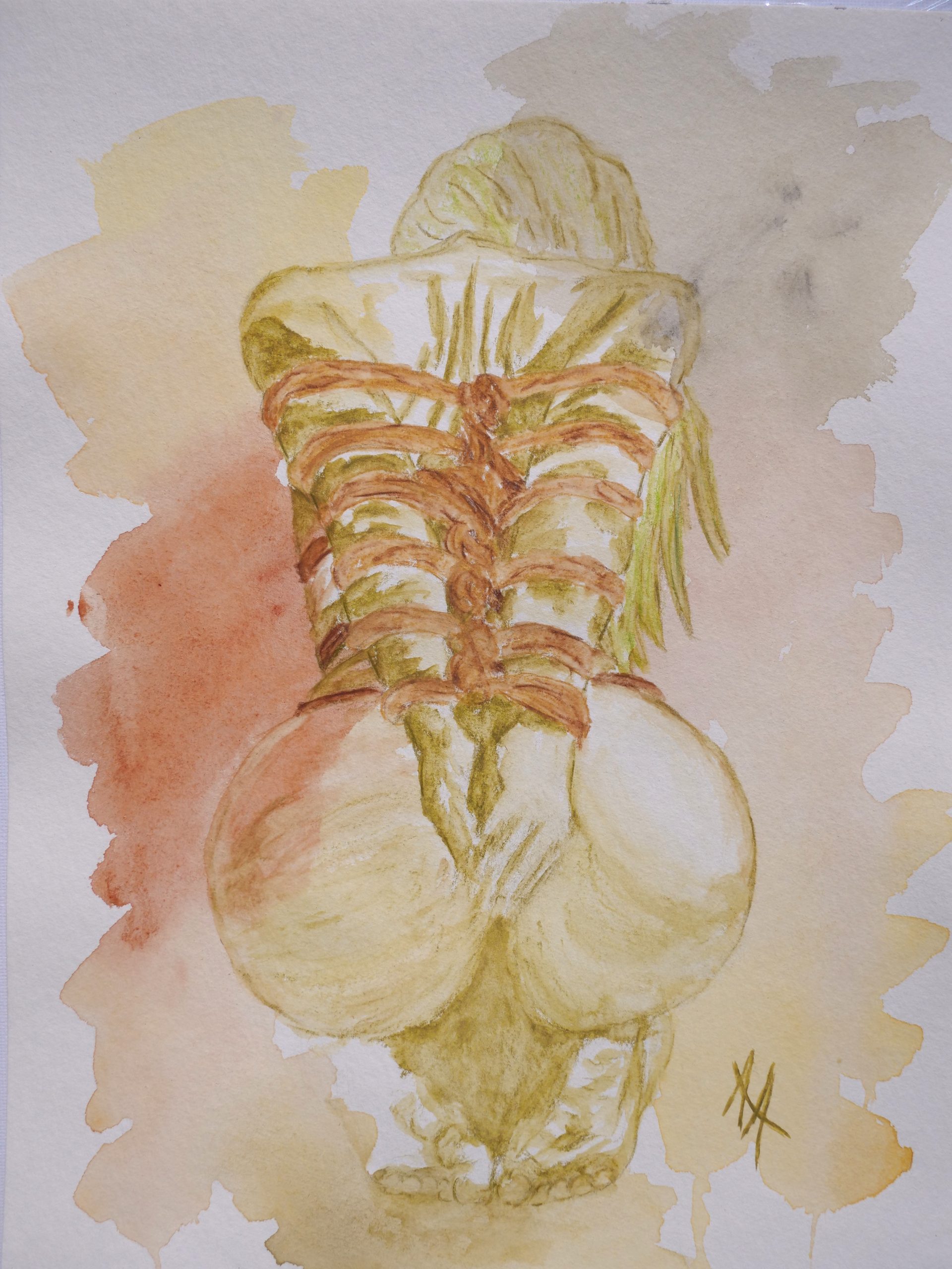 GB:  Bound in Silence captures the delicate balance between surrender and strength in a mesmerizing watercolour portrayal of a naked woman with her arms bound behind her back. The fluid brushstrokes reveal both vulnerability and empowerment, inviting viewers to explore themes of trust, restraint, and intimate tension. This evocative piece melds sensuality with emotional depth, celebrating the complexity of human experience through the graceful form.