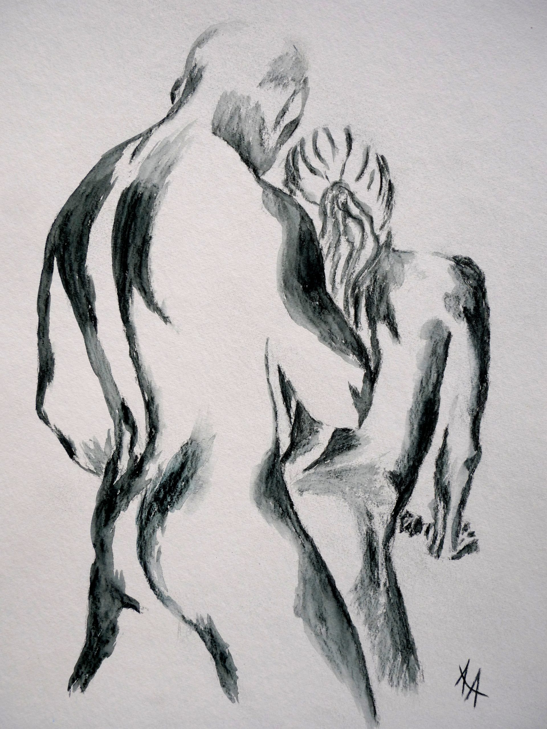 Surrender to the tension of desire with Shadowed Encounter, a striking watercolour painting capturing the raw intimacy of two lovers locked in a moment of unapologetic passion. Rendered in bold, tactile lines and deep shadows, the composition reveals a man and woman joined in a standing embrace from behind—a pose charged with dominance, trust, and connection.